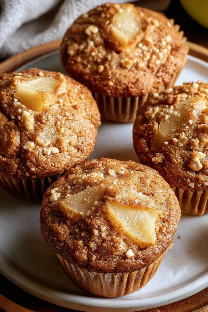 These Spiced Pear Muffins are soft, fluffy, and bursting with warm spices and juicy pear chunks. A cozy treat that pairs perfectly with your favorite beverage.